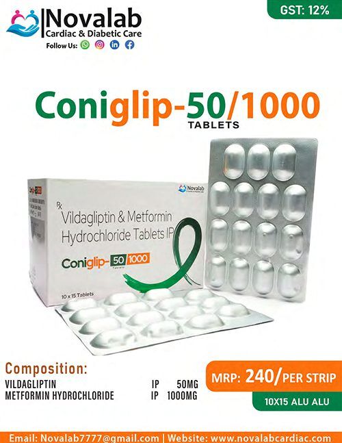 Vildagliptin & Metformin Hydrochloride Tablets are branded as CONIGLIP-50/1000. This drug is a combination of two drugs, viz. Vildagliptin & Metformin Hydrochloride, which is an anti-diabetic drug to treat type 2 diabetes mellitus. It is used to increase the secretion of insulin in the body, which breaks the sugar in the form of energy to carry out day-to-day tasks and activities. It assists in keeping the blood sugar levels in the body balanced. This drug is available in the strengths of Vildagliptin and Metformin Tablets.